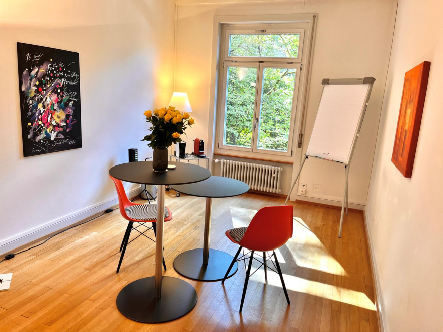 Wir freuen uns, Ihnen unseren kleinen, aber feinen Coachingraum vorstellen zu dürfen! Perfekt für Gespräche zu zweit, bietet er eine ruhige, persönliche Atmosphäre für interaktive Coachings und Meetings. Ausgestattet mit Flipchart, Pinwand, Workshopkoffer ist er ideal, um Gedanken festzuhalten und kreative Lösungen zu erarbeiten. Wer weiss, vielleicht überarbeiten Sie schon bald in diesem Raum Ihre ganz persönliche Entwicklung und setzen neue Ziele für Ihre Zukunft! Wir freuen uns auf Sie!
